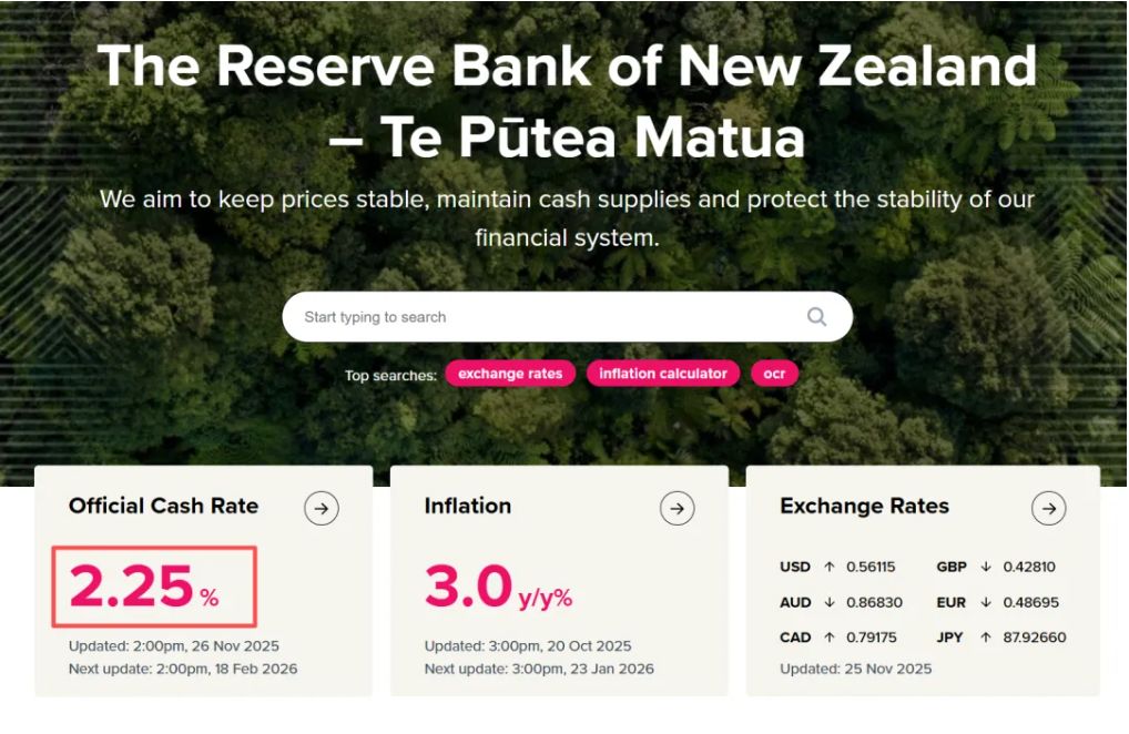 11月26日,新西蘭聯(lián)儲宣布將官方現(xiàn)金利率(OCR)下調(diào)25個基點(diǎn)至2.25%。