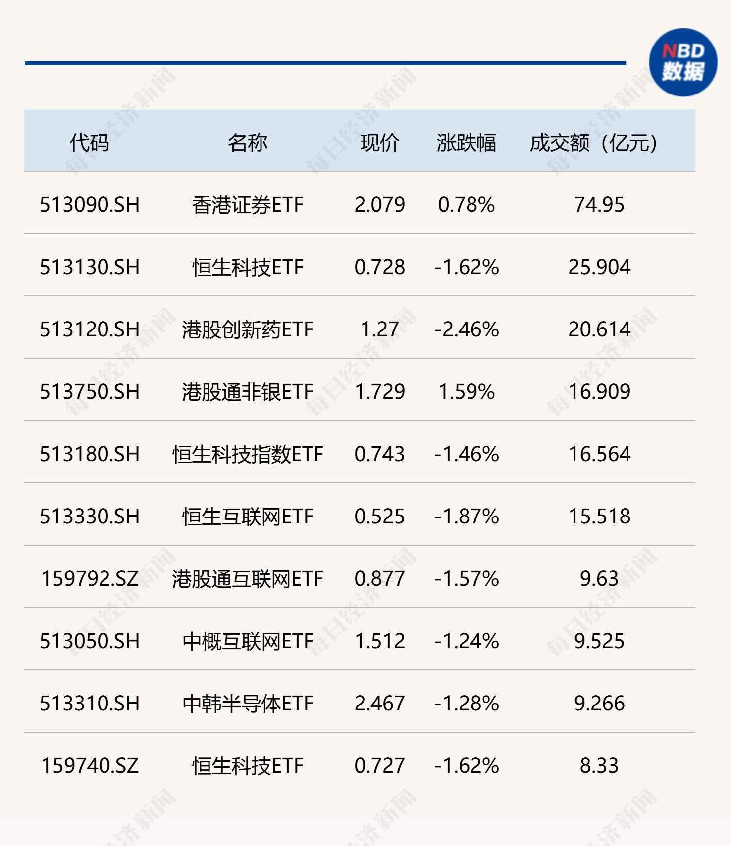今日早盤,市場(chǎng)震蕩調(diào)整,科創(chuàng)芯片和證券相關(guān)ETF交投活躍。科創(chuàng)芯片ETF、證券ETF半日成交額超14億元??缇矱TF方面,香港證券ETF半日成交超74億元。