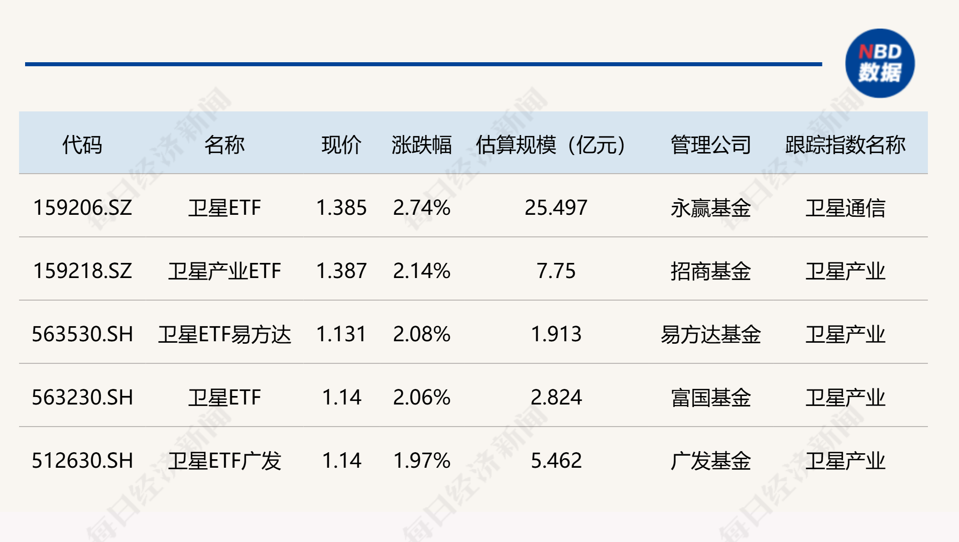 點(diǎn)評(píng):衛(wèi)星ETF(159206)早盤漲超2.7%,該產(chǎn)品跟蹤國(guó)證商用衛(wèi)星通信產(chǎn)業(yè)指數(shù),目前規(guī)模超25億元。而衛(wèi)星產(chǎn)業(yè)ETF(159218)、衛(wèi)星ETF易方達(dá)(563530)和衛(wèi)星ETF(563230)跟蹤中證衛(wèi)星產(chǎn)業(yè)指數(shù),早盤均漲超2%。