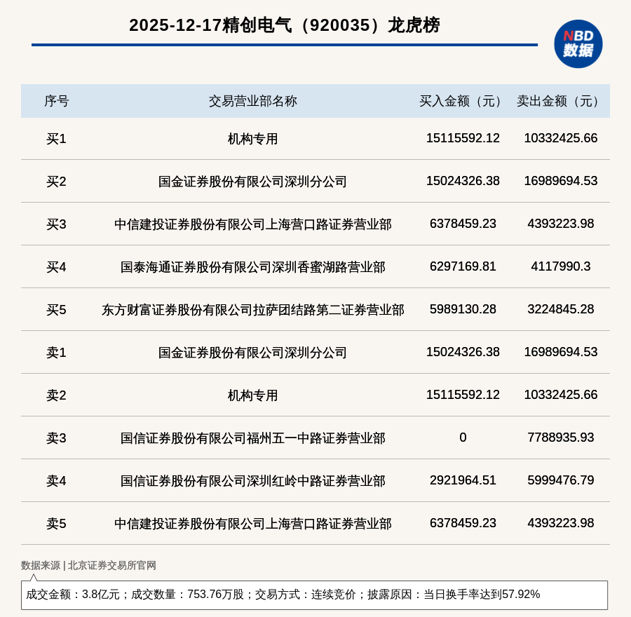 每經(jīng)訊,2025年12月17日,北交所上市公司精創(chuàng)電氣(920035,收盤價:48.47元)登上龍虎榜,交易方式是連續(xù)競價,披露原因是當(dāng)日換手率達(dá)到57.92%,成交數(shù)量753.76萬股,成交金額3.8億元。買一席位為機(jī)構(gòu)專用,買入1511.56萬元;賣一席位為國金證券股份有限公司深圳分公司,賣出1698.97萬元。