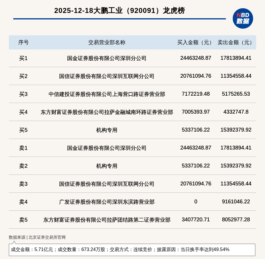 每經(jīng)訊,2025年12月18日,北交所上市公司大鵬工業(yè)(920091,收盤價:81.85元)登上龍虎榜,交易方式是連續(xù)競價,披露原因是當日換手率達到49.54%,成交數(shù)量673.24萬股,成交金額5.71億元。買一席位為國金證券股份有限公司深圳分公司,買入2446.32萬元;賣一席位為國金證券股份有限公司深圳分公司,賣出1781.39萬元。