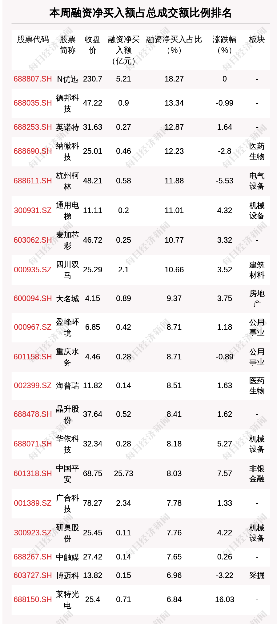 兩市共有8只股票融資凈買入額占總成交金額比例超10%,其中N優(yōu)迅、德邦科技、英諾特排名前三,占比分別為18.27%、13.34%、12.87%。