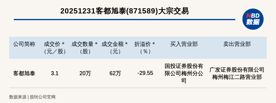 每經(jīng)訊,2025年12月31日,新三板創(chuàng)新層公司客都旭泰(871589,收盤(pán)價(jià):4.4元)發(fā)生一筆大宗交易,成交價(jià)3.1元/股,成交數(shù)量20萬(wàn)股,成交金額62萬(wàn)元,折價(jià)29.55%。買(mǎi)入營(yíng)業(yè)部是國(guó)投證券股份有限公司梅州分公司,賣(mài)出營(yíng)業(yè)部是廣發(fā)證券股份有限公司梅州梅江二路營(yíng)業(yè)部。