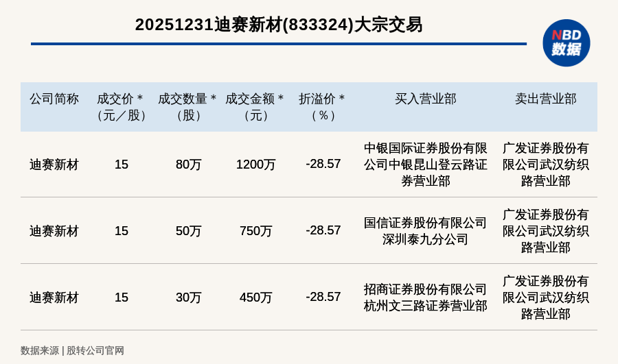 每經(jīng)訊,2025年12月31日,新三板基礎(chǔ)層公司迪賽新材(833324,收盤價(jià):21元)發(fā)生3筆大宗交易,總成交金額為2400萬元,成交金額最高的一筆成交價(jià)15元/股,成交數(shù)量80萬股,成交金額1200萬元,折價(jià)28.57%。買入營業(yè)部是中銀國際證券股份有限公司中銀昆山登云路證券營業(yè)部,賣出營業(yè)部是廣發(fā)證券股份有限公司武漢紡織路營業(yè)部。