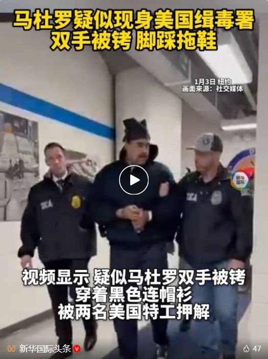 據(jù)新華國(guó)際頭條,當(dāng)?shù)貢r(shí)間1月3日,美國(guó)白宮快速反應(yīng)小組社交媒體賬號(hào)RapidResponse47轉(zhuǎn)發(fā)了一段視頻,記錄了疑似委內(nèi)瑞拉總統(tǒng)馬杜羅被押送抵達(dá)美國(guó)緝毒署(DEA)的視頻。