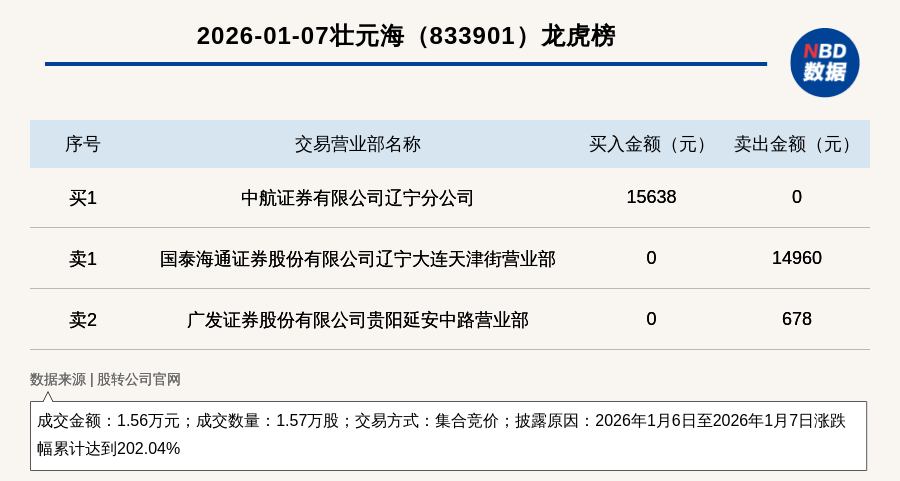 每經(jīng)訊,2026年1月7日,新三板基礎(chǔ)層公司壯元海(833901,收盤價:1.48元)登上龍虎榜,交易方式是集合競價,披露原因是2026年1月6日至2026年1月7日漲跌幅累計達到202.04%,成交數(shù)量1.57萬股,成交金額1.56萬元。買一席位為中航證券有限公司遼寧分公司,買入1.56萬元;賣一席位為國泰海通證券股份有限公司遼寧大連天津街營業(yè)部,賣出1.5萬元。