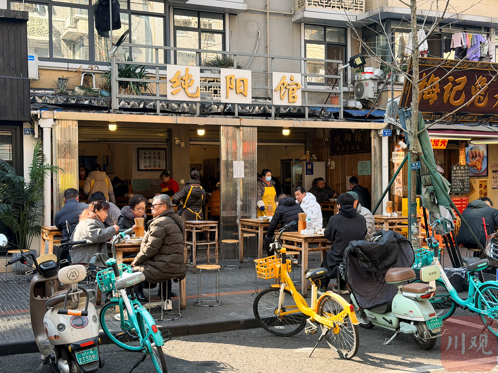 此時,同樣把門店開在餐飲門店扎堆的吉祥街上,開了22年的“純陽館”,20多張小餐桌已經坐滿食客,街邊上還站著不少等待進店點餐的客人,16名店員全員上陣服務。這陣仗,每天都差不多。