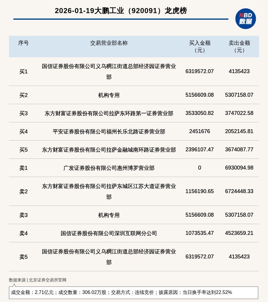 每經(jīng)訊,2026年1月19日,北交所上市公司大鵬工業(yè)(920091,收盤價:88元)登上龍虎榜,交易方式是連續(xù)競價,披露原因是當日換手率達到22.52%,成交數(shù)量306.02萬股,成交金額2.71億元。買一席位為國信證券股份有限公司義烏稠江街道總部經(jīng)濟園證券營業(yè)部,買入631.96萬元;賣一席位為廣發(fā)證券股份有限公司惠州博羅營業(yè)部,賣出693.01萬元。