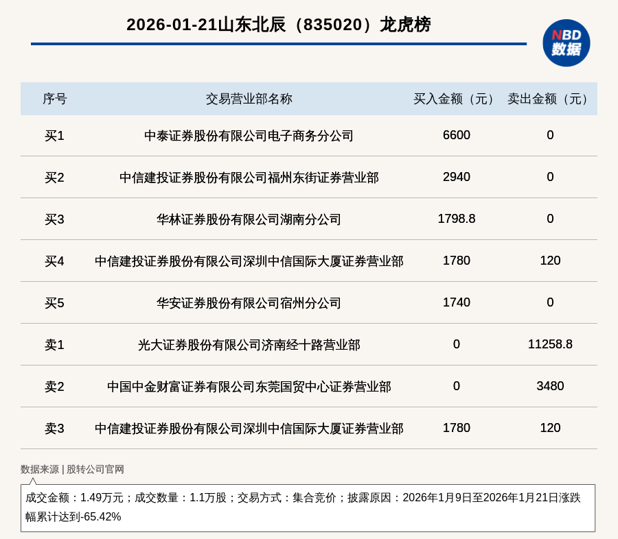 每經(jīng)訊,2026年1月21日,新三板創(chuàng)新層公司山東北辰(835020,收盤價(jià):1.2元)登上龍虎榜,交易方式是集合競(jìng)價(jià),披露原因是2026年1月9日至2026年1月21日漲跌幅累計(jì)達(dá)到-65.42%,成交數(shù)量1.1萬(wàn)股,成交金額1.49萬(wàn)元。買一席位為中泰證券股份有限公司電子商務(wù)分公司,買入6600元;賣一席位為光大證券股份有限公司濟(jì)南經(jīng)十路營(yíng)業(yè)部,賣出1.13萬(wàn)元。