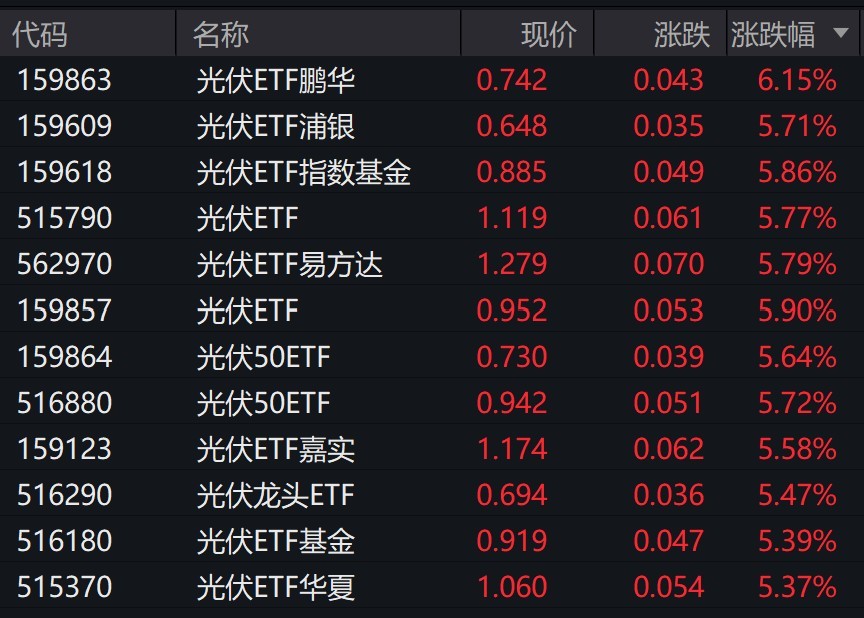 受盤面影響,光伏相關(guān)ETF集體漲超5%。