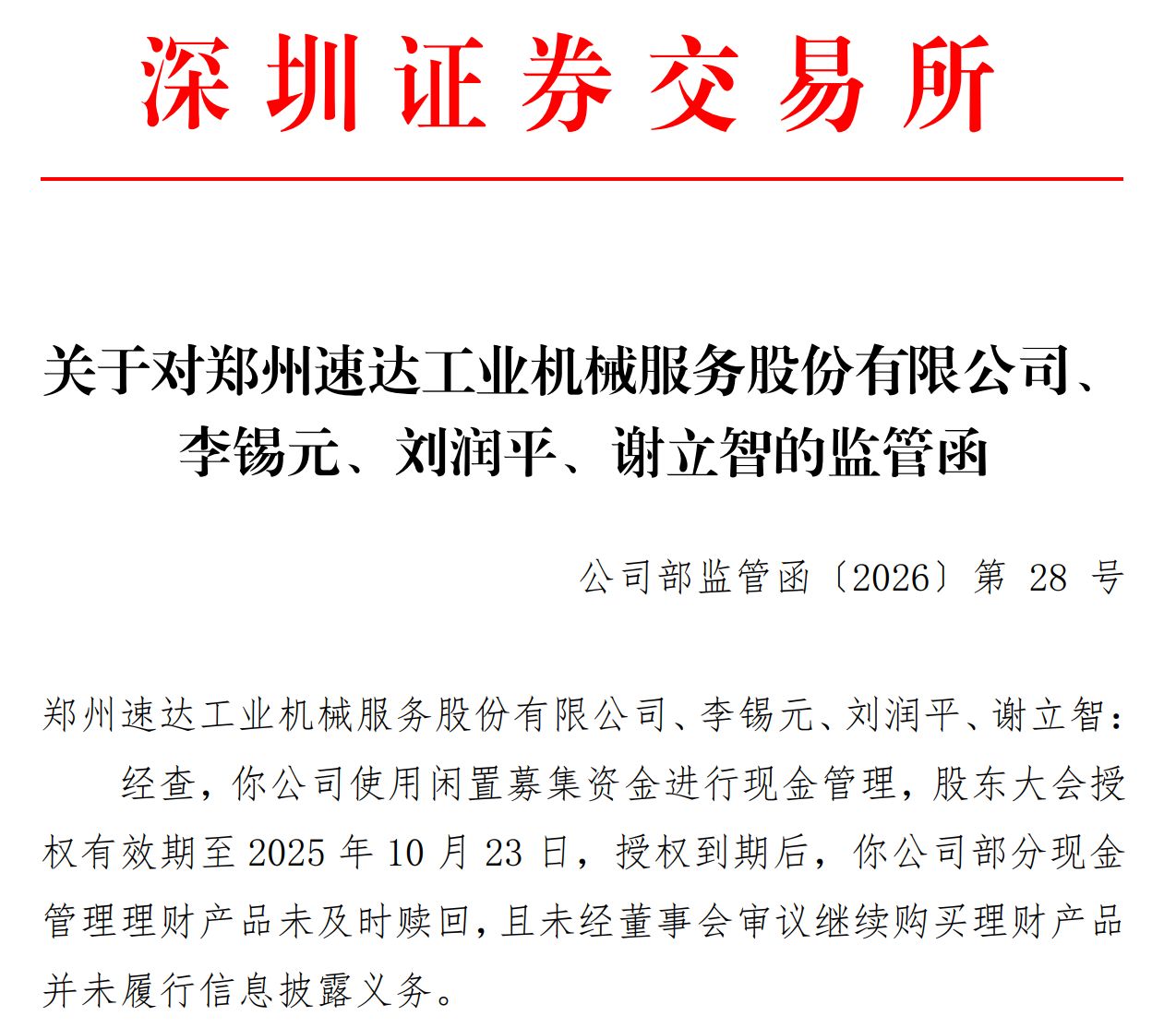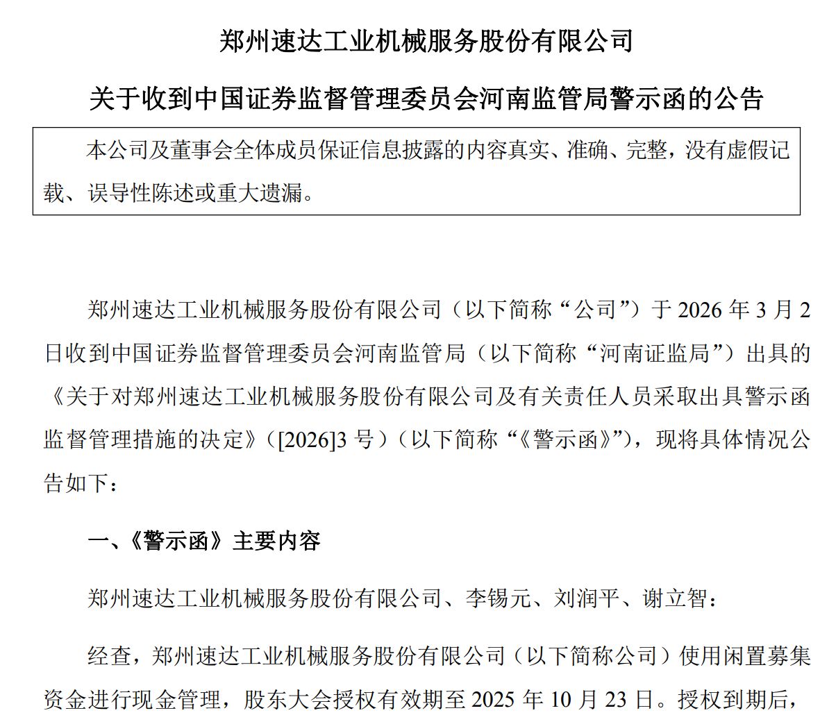 2026年3月2日,深交所與河南證監(jiān)局相繼對(duì)速達(dá)股份發(fā)出監(jiān)管函和警示函,直指公司在使用閑置募集資金進(jìn)行現(xiàn)金管理時(shí),存在授權(quán)到期后繼續(xù)購(gòu)買理財(cái)產(chǎn)品且未及時(shí)贖回的違規(guī)行為。