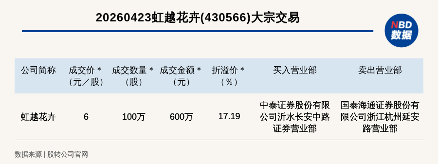 每經(jīng)訊,2026年4月23日,新三板創(chuàng)新層公司虹越花卉(430566,收盤價:5.12元)發(fā)生一筆大宗交易,成交價6元/股,成交數(shù)量100萬股,成交金額600萬元,溢價17.19%。買入營業(yè)部是中泰證券股份有限公司沂水長安中路證券營業(yè)部,賣出營業(yè)部是國泰海通證券股份有限公司浙江杭州延安路營業(yè)部。