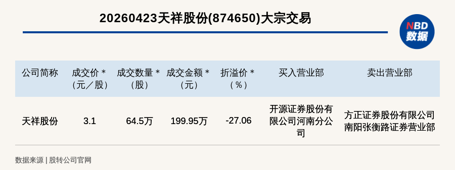 每經(jīng)訊,2026年4月23日,新三板基礎(chǔ)層公司天祥股份(874650,收盤價(jià):4.25元)發(fā)生一筆大宗交易,成交價(jià)3.1元/股,成交數(shù)量64.5萬股,成交金額199.95萬元,折價(jià)27.06%。買入營(yíng)業(yè)部是開源證券股份有限公司河南分公司,賣出營(yíng)業(yè)部是方正證券股份有限公司南陽張衡路證券營(yíng)業(yè)部。