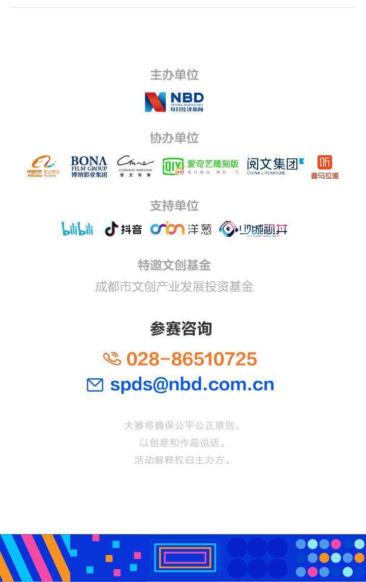 “第二屆影像天府·短視頻創(chuàng)攝大賽”于2020年4月正式啟動(dòng),邀約全球創(chuàng)攝愛好者續(xù)寫“成都,一座來了就不想離開的城市”篇章,征集優(yōu)質(zhì)影像作品。本次大賽設(shè)置最佳天府表達(dá)短視頻、最佳外文短視頻、最佳導(dǎo)演獎(jiǎng)、最佳創(chuàng)意獎(jiǎng)、最佳技術(shù)創(chuàng)新獎(jiǎng)、最佳攝影獎(jiǎng)六大專業(yè)。評(píng)委包括中國電影家協(xié)會(huì)副主席,上海電影家協(xié)會(huì)主席任仲倫;艾美獎(jiǎng)得主,美國著名影視導(dǎo)演、制片人Mark Zaslove;著名導(dǎo)演、編劇、制片人蔣欽民;洋蔥視頻聯(lián)合創(chuàng)始人聶陽德......